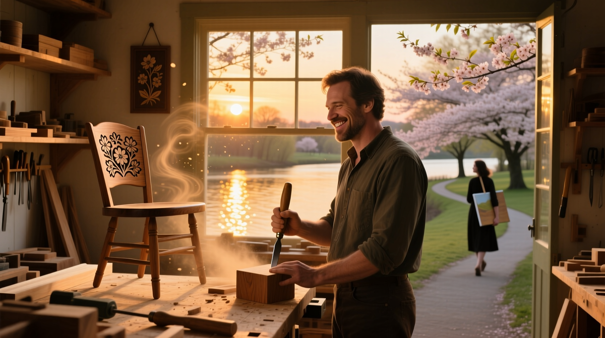 Осень в этом маленьком городке у реки всегда пронизана легкой грустью и тёплыми воспоминаниями. Ветер шепчет, листья медленно кружатся, и тени прошлого кажется сложно вытеснить. За окном мастерской, где пахнет свежей краской и деревом, солнечный луч пробивается сквозь облака, расцвечивая всё вокруг золотом. Сердце стучит ровно, но внутри зреет лёгкий трепет; она написала вчера в сообщении: "Видела тебя в кафе. С ней. Почему ты улыбаешься?". Почему? — размышляет он, усмехаясь. Улыбка стала частью его жизни без стен.