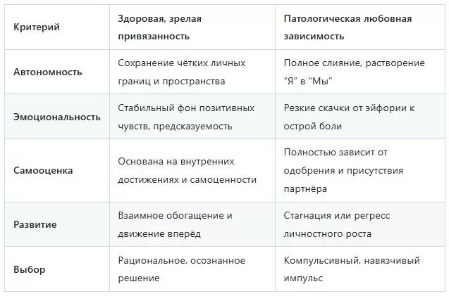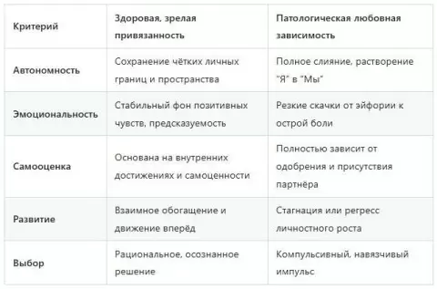 В отличие от здоровых отношений, способствующих личностному росту, любовная зависимость ограничивает горизонты, затмевая всё остальное. Она проявляется в утрате самоконтроля и маниакальной необходимости в подтверждении своих чувств, что приводит к жертвованию собственными интересами ради поддержания связи.