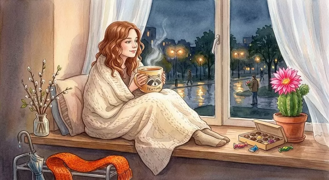 Вернувшись домой, она обнаружила, что кактус наконец расцвел. С чашкой чая и конфетами под любимым фильмом она получила сообщение от подруги с вопросом о празднике: "Как отмечаешь?" Надежда с улыбкой ответила: "Отлично! Я зацвела".