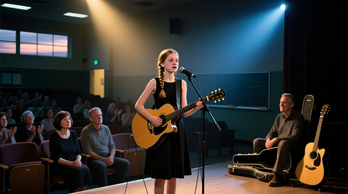 На сцене появляется девушка, трудно сказать, сколько ей лет, но, похоже, около пятнадцати. У неё простое черное платье и заплетенные волосы. Она берёт микрофон, взгляд опускается, но вскоре поднимается.