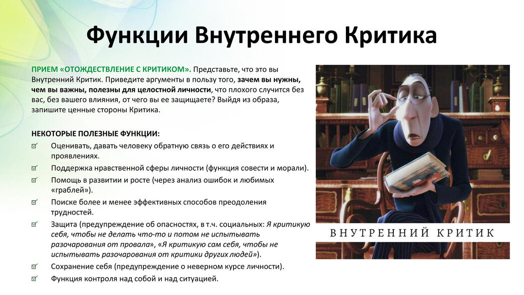 Теперь, когда критик стал менее абстрактным и более понятным, можно перейти к следующему этапу — начать диалог с ним. В следующей статье цикла будут даны советы, как поблагодарить критика за его роль и переназначить его в более конструктивную функцию в вашей жизни.